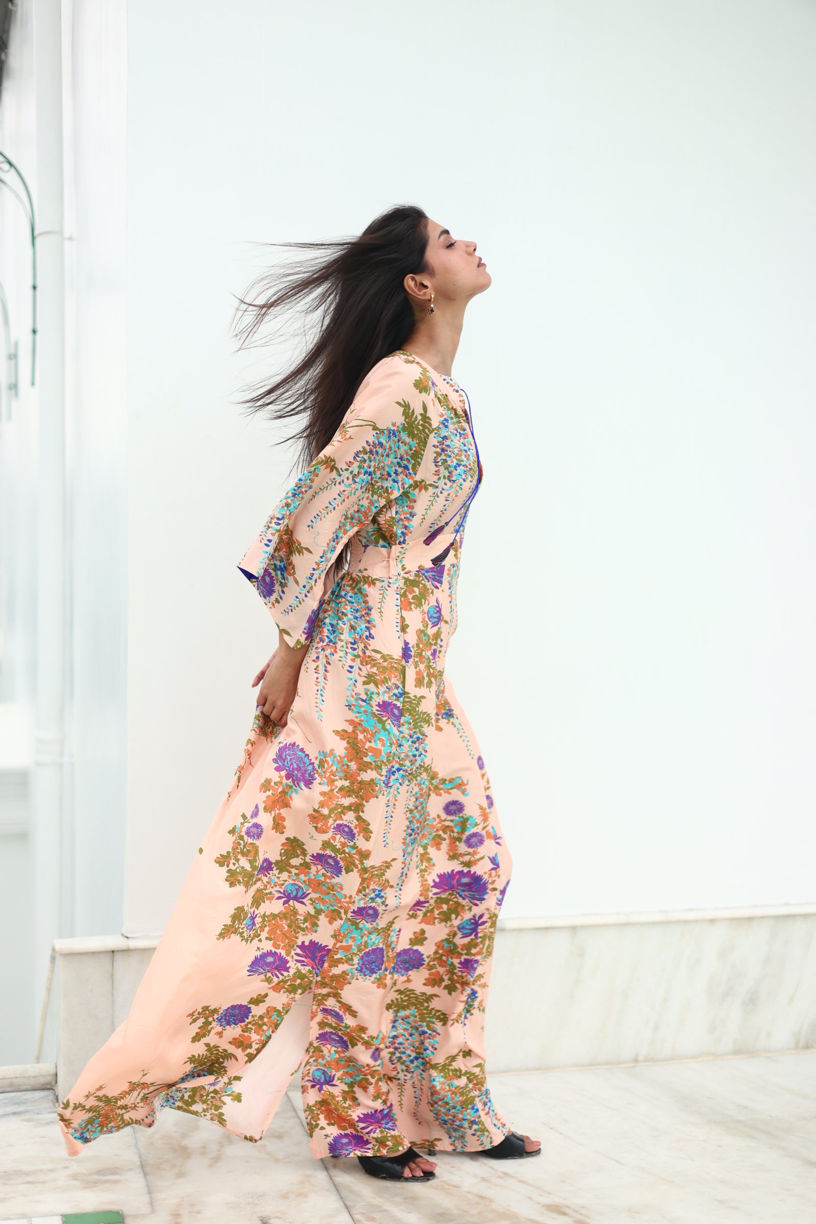 VEENA LONG DRESS IN SILK VELVET HAND EMBROIDERERD NECKLINE